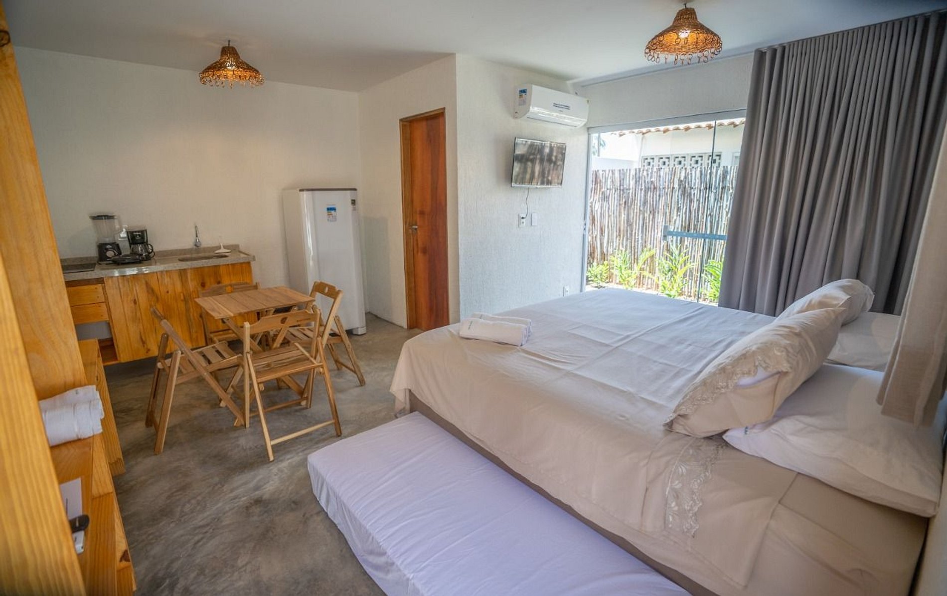A acomodação dispõe de TV e banheiro privativo com chuveiro, enquanto a cozinha tem geladeira e fogão.