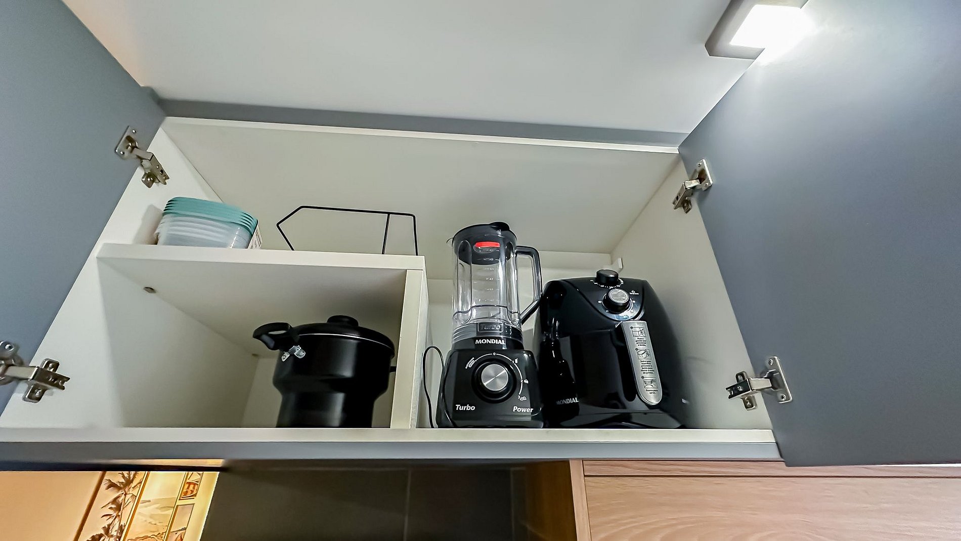 Cozinha equipada: Geladeira, micro-ondas, cafeteira, liquidificador, pia e utensílios básicos para cozinhar;