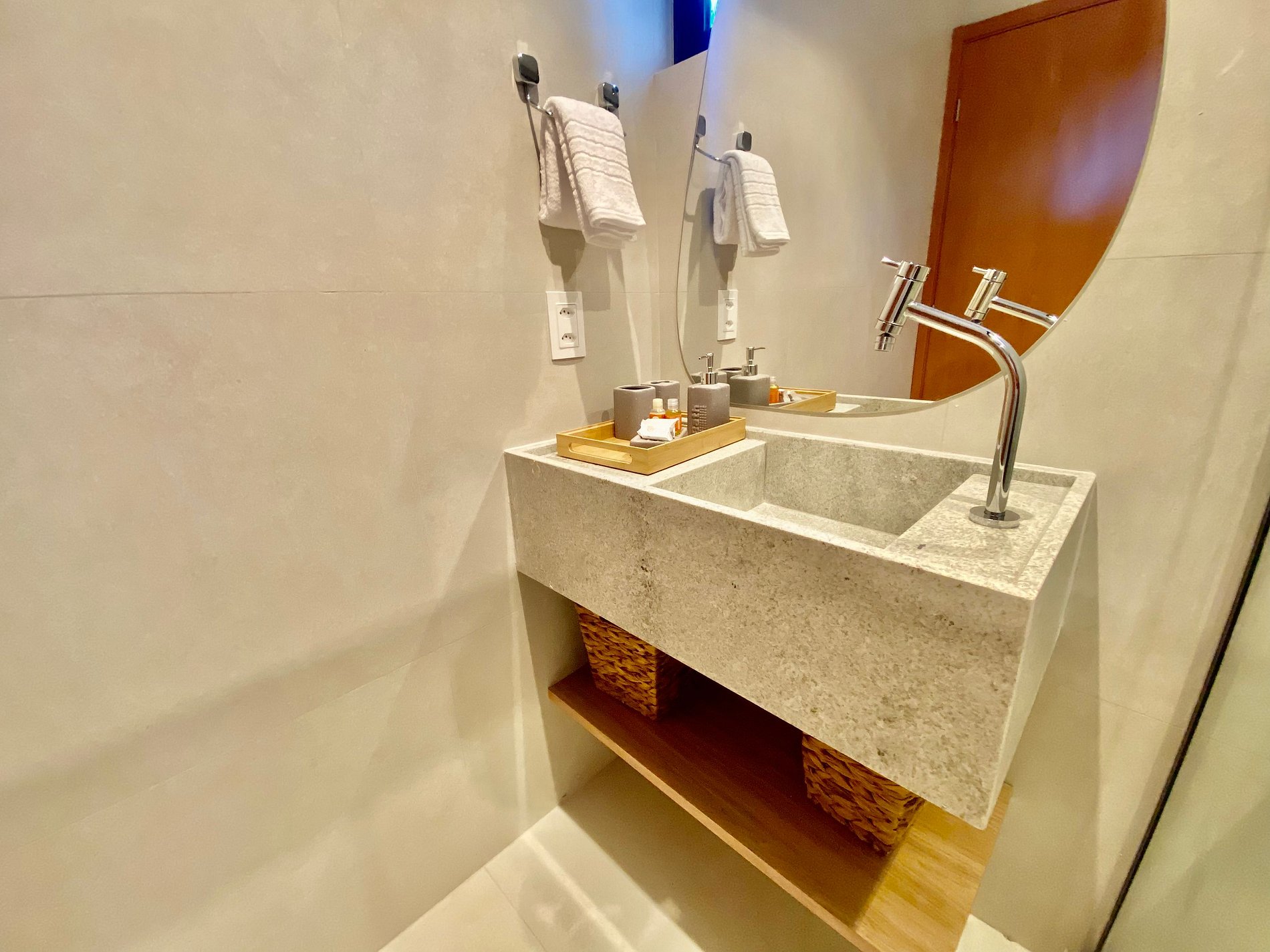O Studio possui 37m2, com sala de estar com varanda gourmet, cozinha e 01 vaga de estacionamento.