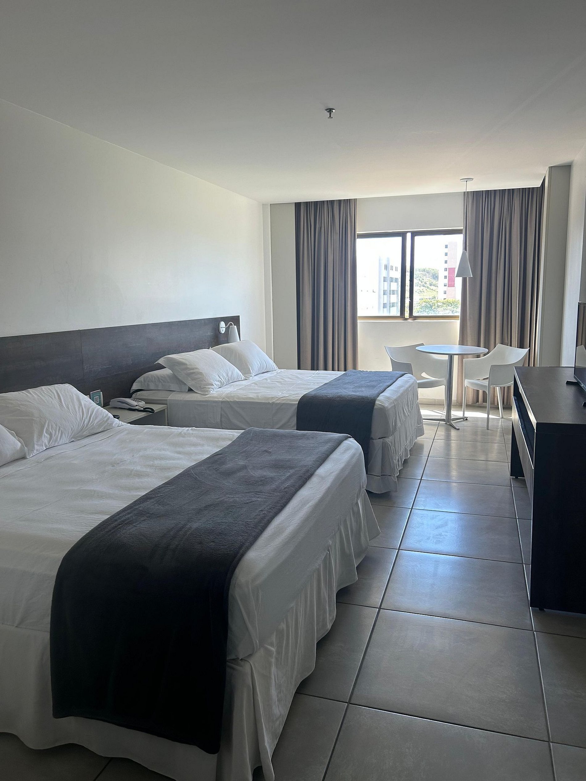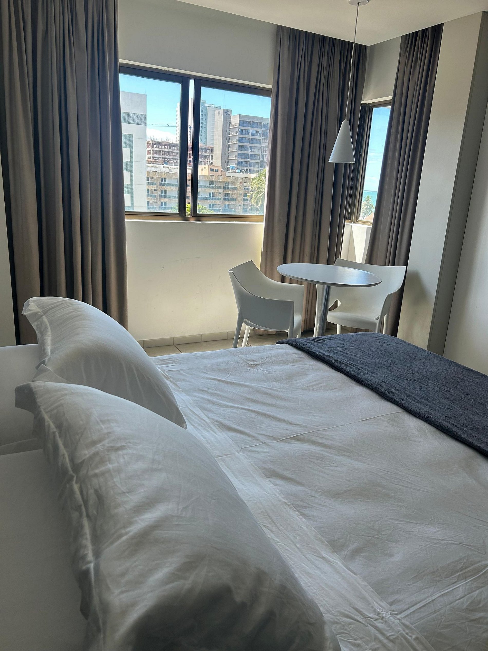 Quarto perfeito pra quem busca se hospedar a beira-mar em Maceió, a unidade possui 2 camas confortáveis de casal e acomoda até 04 pessoas com um banheiro completo e um frigobar, com uma linda vista da praia que pode apreciada da sua janela. O quarto fica na posição nascente que permite ver o nascer do Sol.