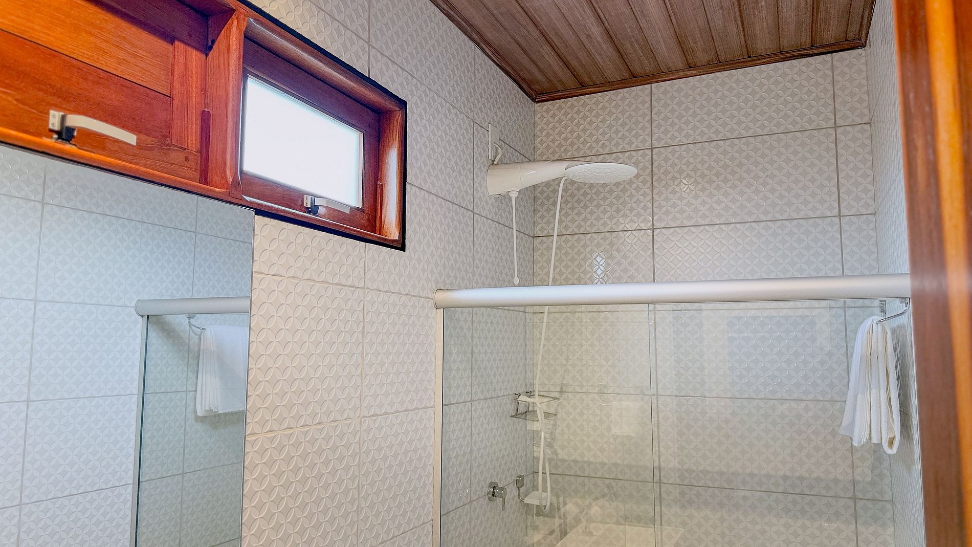O banheiro, embora compacto, é bem planejado com revestimentos claros e um box de vidro, que otimiza o espaço e facilita a limpeza, além de transmitir uma sensação de higiene. A presença de um chuveirinho (ducha higiênica) é um toque de conforto adicional.