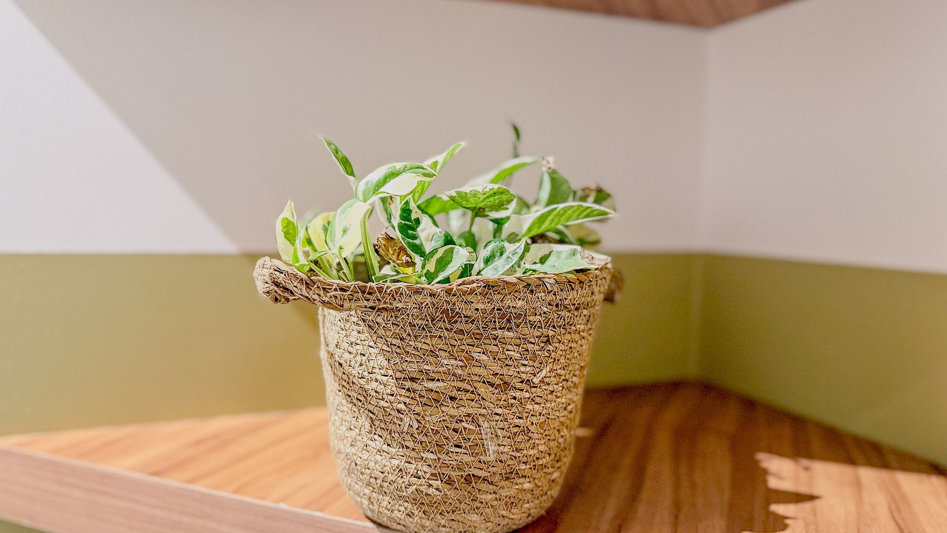 Pequenos arranjos de plantas e a inspiração em elementos orgânicos (a mesa de canto, as folhas de cerâmica) trazem o verde e a vitalidade para dentro do ambiente, criando uma atmosfera mais relaxante e saudável.