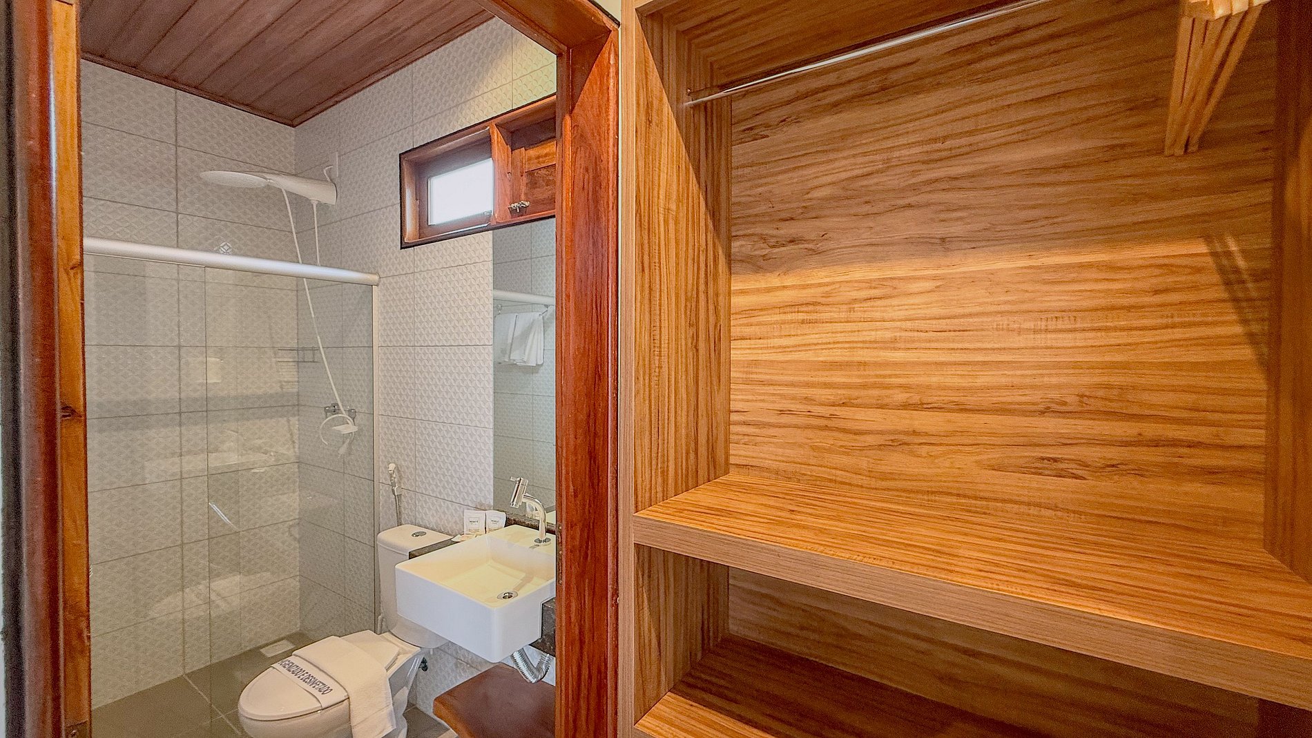 O uso predominante da madeira no forro, no guarda-corpo da varanda, nas esquadrias e em detalhes de mobiliário (como a mesa de cabeceira orgânica) é a alma do projeto. Ela traz aconchego, calor e uma autenticidade inegável, remetendo às construções tradicionais praianas.