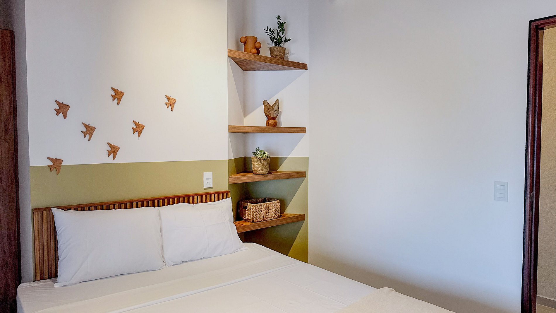 Os adornos de cerâmica na parede do quarto (pássaros, folhas e prato decorativo) e a bancada da pia externa com base rústica de madeira são toques *especiais*. Eles não são meros objetos, mas expressões de arte e artesanato, que conferem personalidade única e um senso de lugar, valorizando a cultura local.