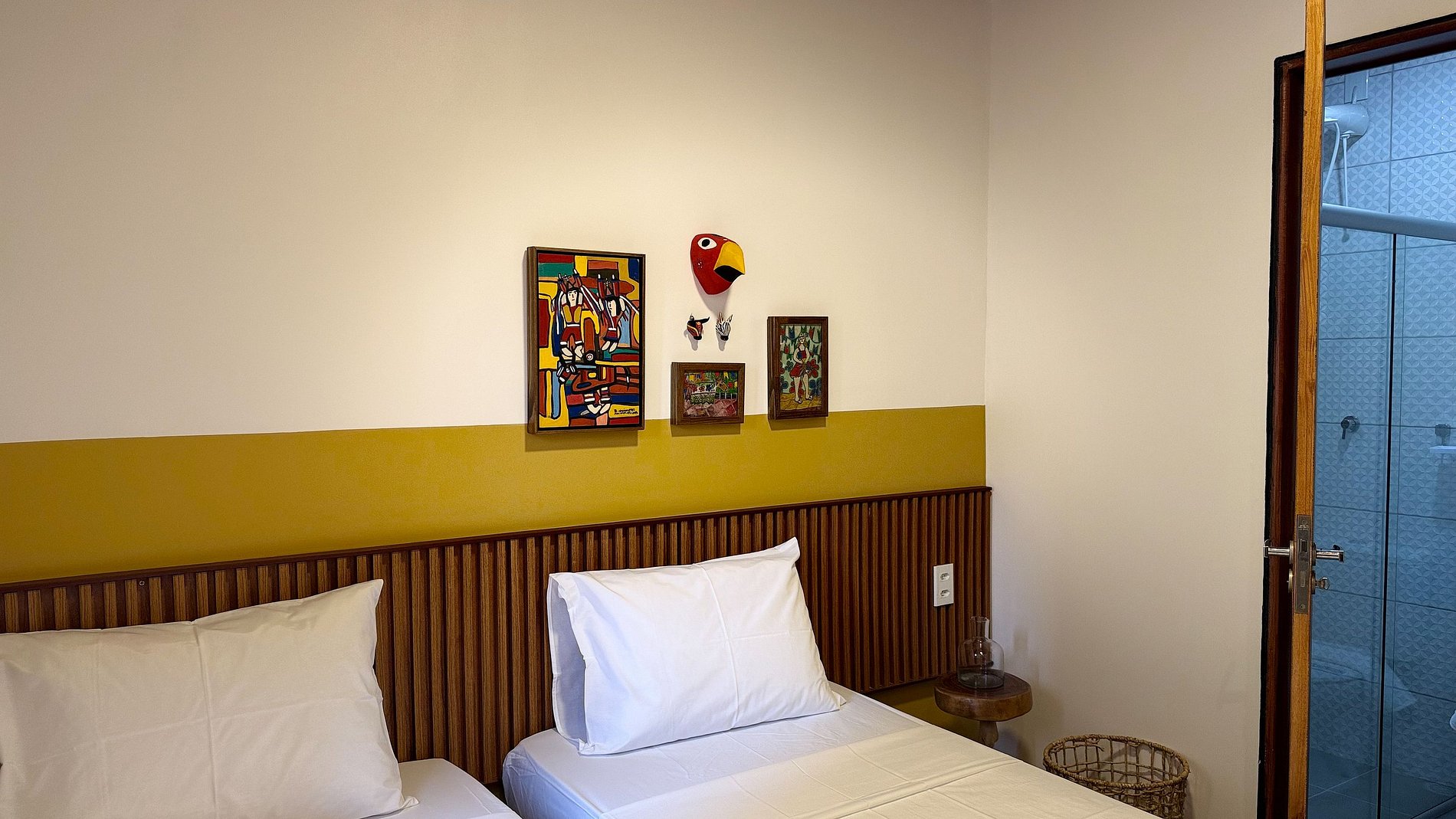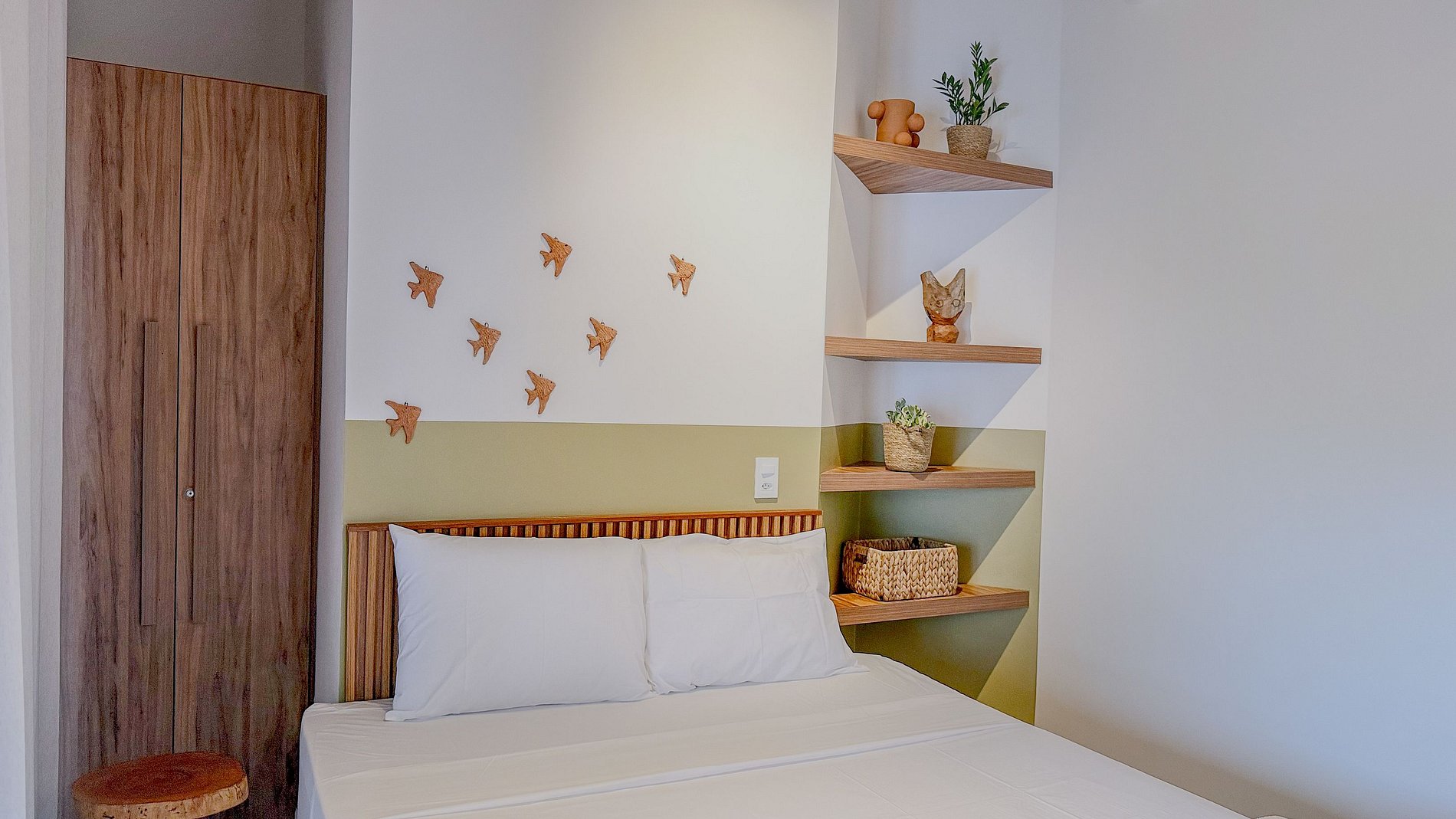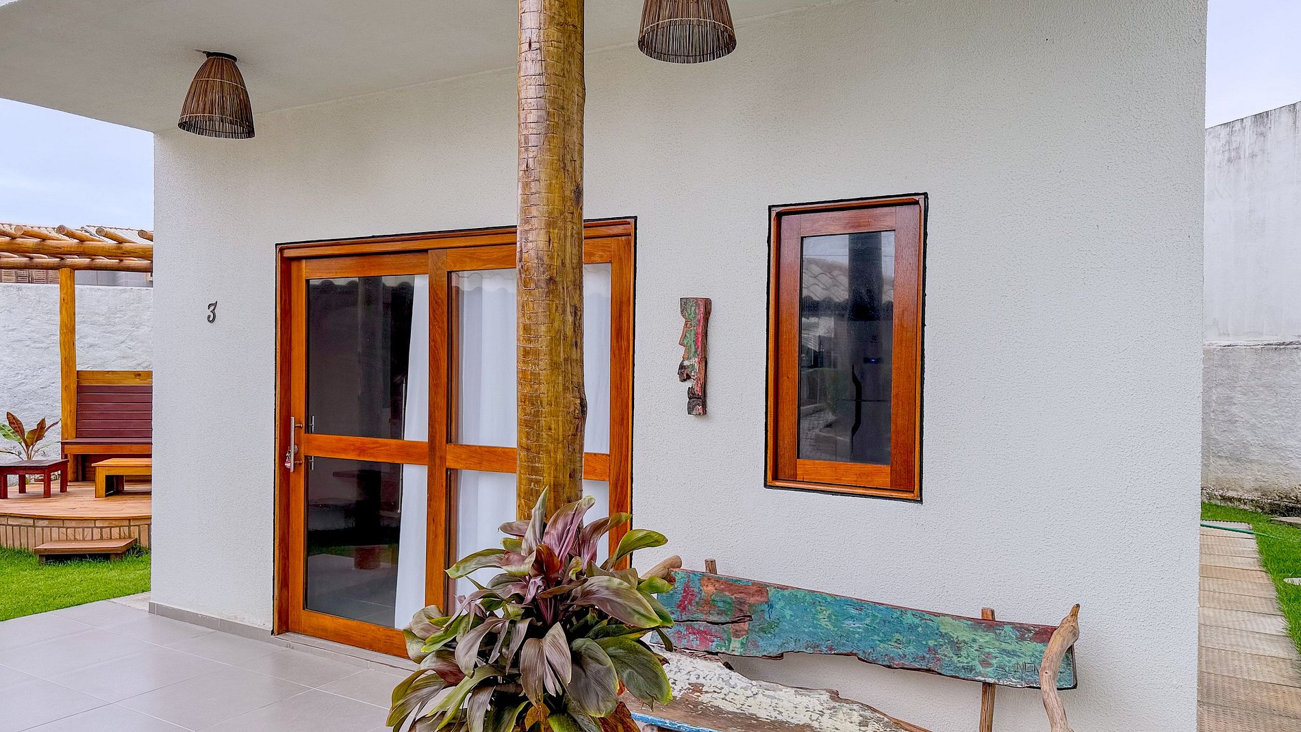 Os adornos de cerâmica na parede do quarto (pássaros, folhas e prato decorativo) e a bancada da pia externa com base rústica de madeira são toques *especiais*. Eles não são meros objetos, mas expressões de arte e artesanato, que conferem personalidade única e um senso de lugar, valorizando a cultura local.