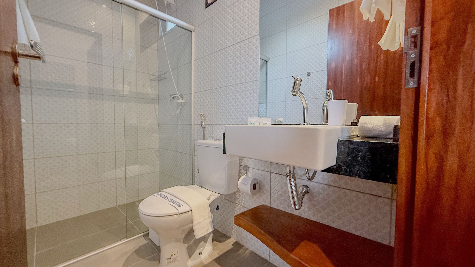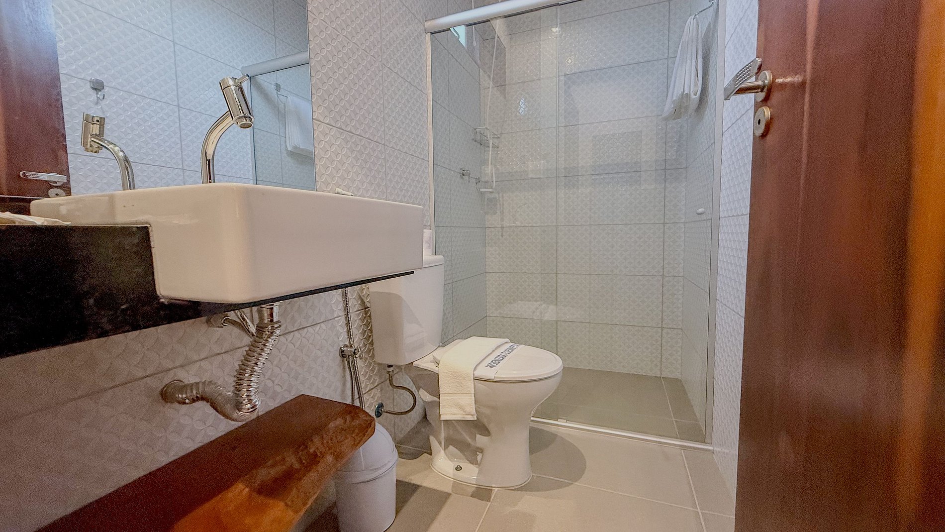 O banheiro, embora compacto, é bem planejado com revestimentos claros e um box de vidro, que otimiza o espaço e facilita a limpeza, além de transmitir uma sensação de higiene. A presença de um chuveirinho (ducha higiênica) é um toque de conforto adicional.