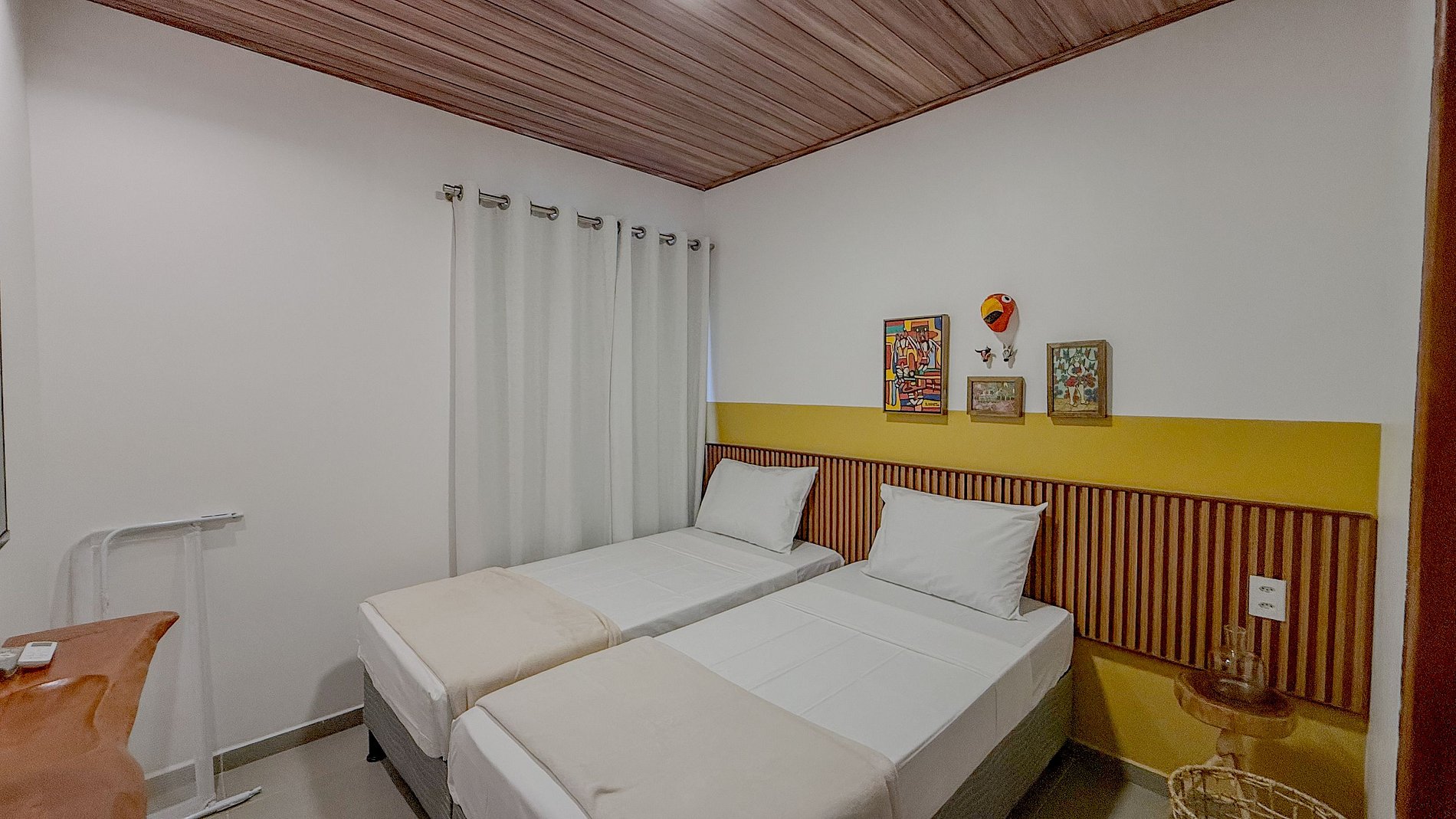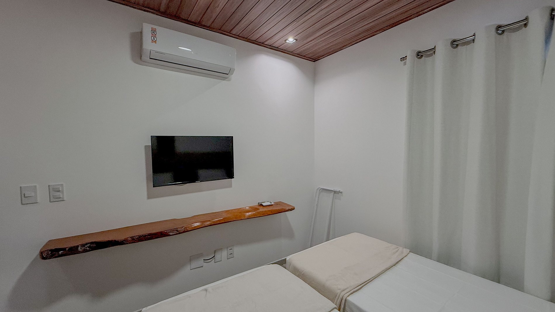 As camas com enxoval branco e limpo sugerem higiene e frescor, essenciais para uma boa noite de sono após um dia na praia. A presença de ar-condicionado é crucial para o conforto térmico em climas quentes.