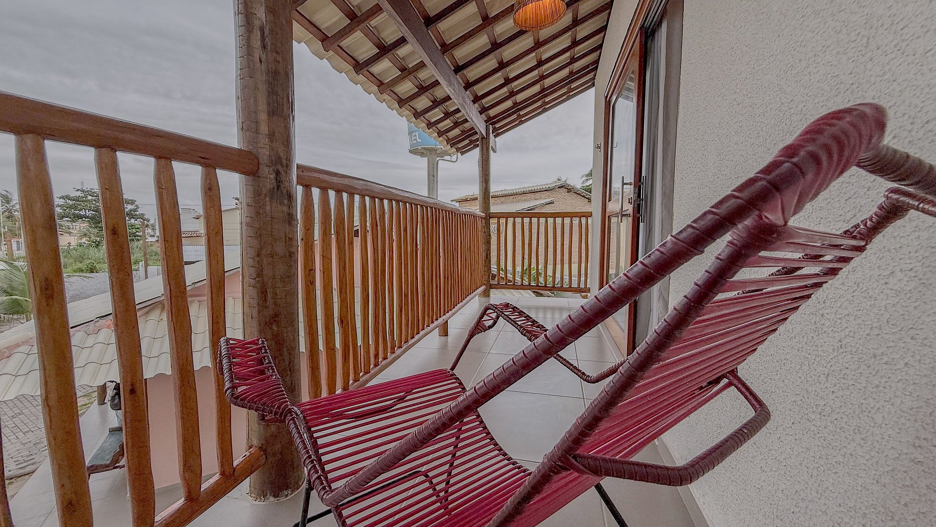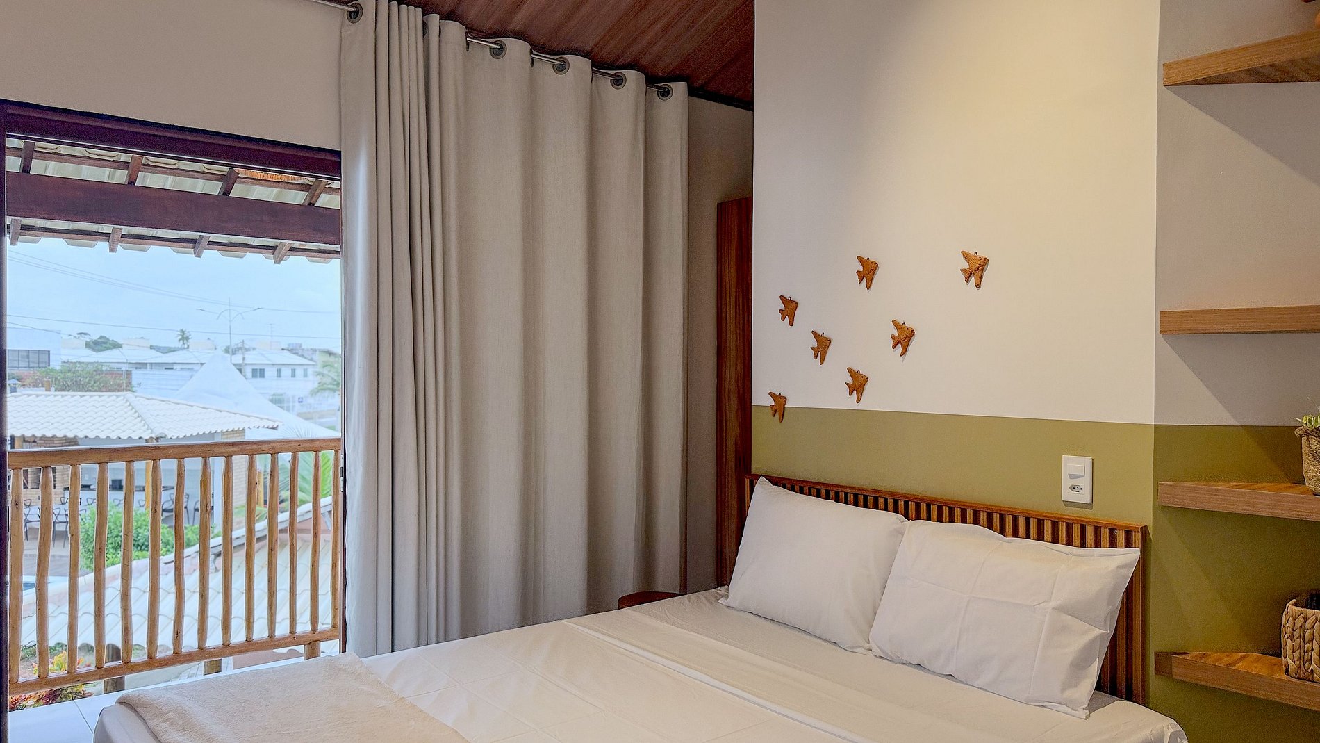A presença de uma varanda espaçosa com mobiliário para relaxamento (vista na foto externa) é um diferencial. Ela funciona como uma extensão do quarto, convidando o hóspede a aproveitar a brisa, a luz natural e a paisagem local, diluindo as barreiras entre dentro e fora.