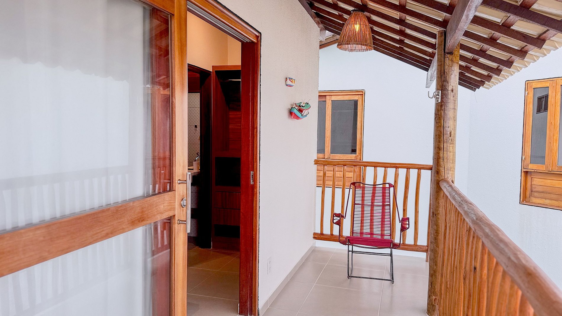 O uso predominante da madeira no forro, no guarda-corpo da varanda, nas esquadrias e em detalhes de mobiliário (como a mesa de cabeceira orgânica) é a alma do projeto. Ela traz aconchego, calor e uma autenticidade inegável, remetendo às construções tradicionais praianas.