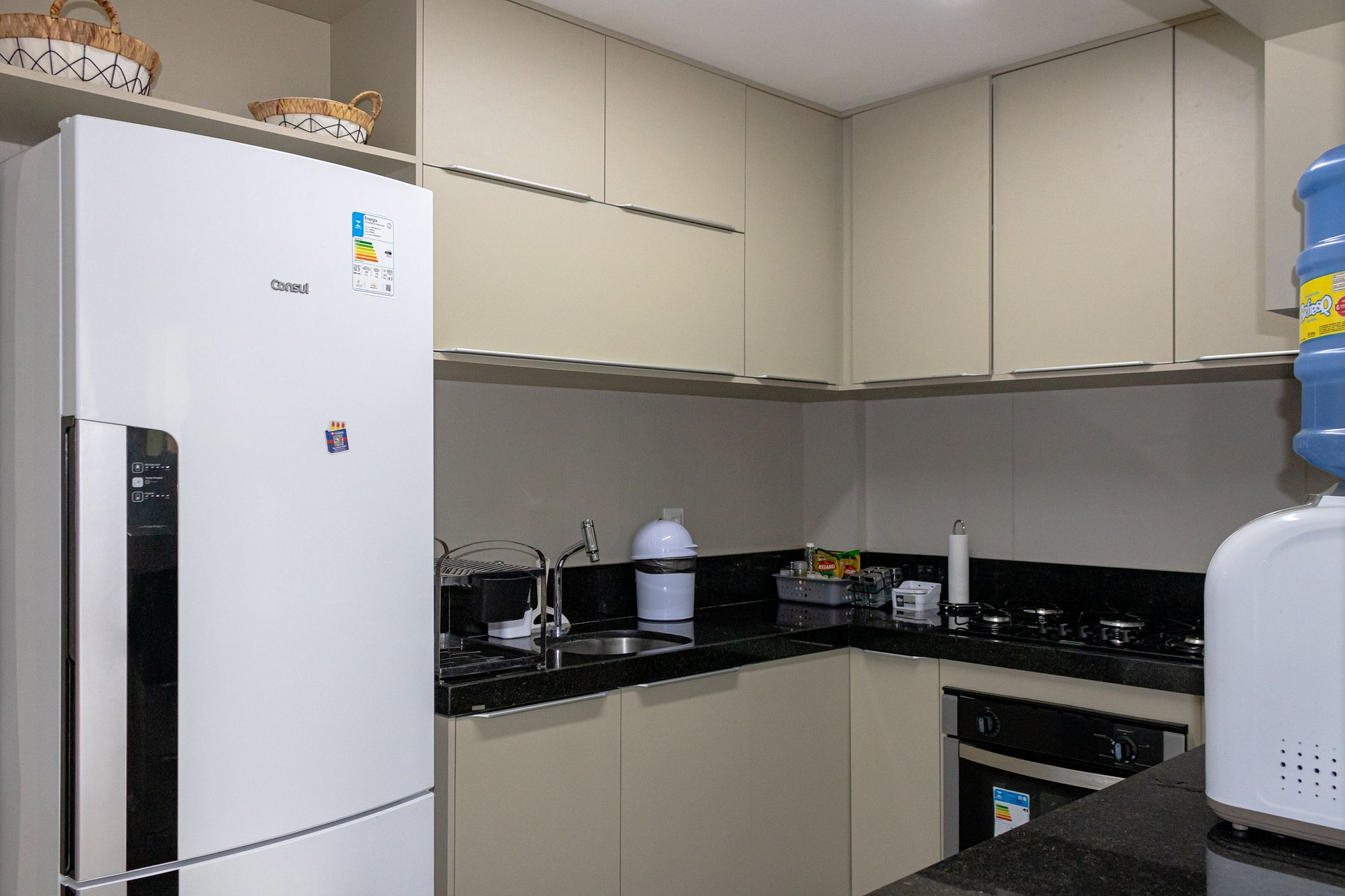 A cozinha é contemporânea, equipada com eletrodomésticos modernos, bancadas em granito, e armários planejados. O design aberto da cozinha permite uma integração perfeita com a sala de estar e a varanda, tornando o ambiente perfeito para quem gosta de cozinhar e socializar ao mesmo tempo.