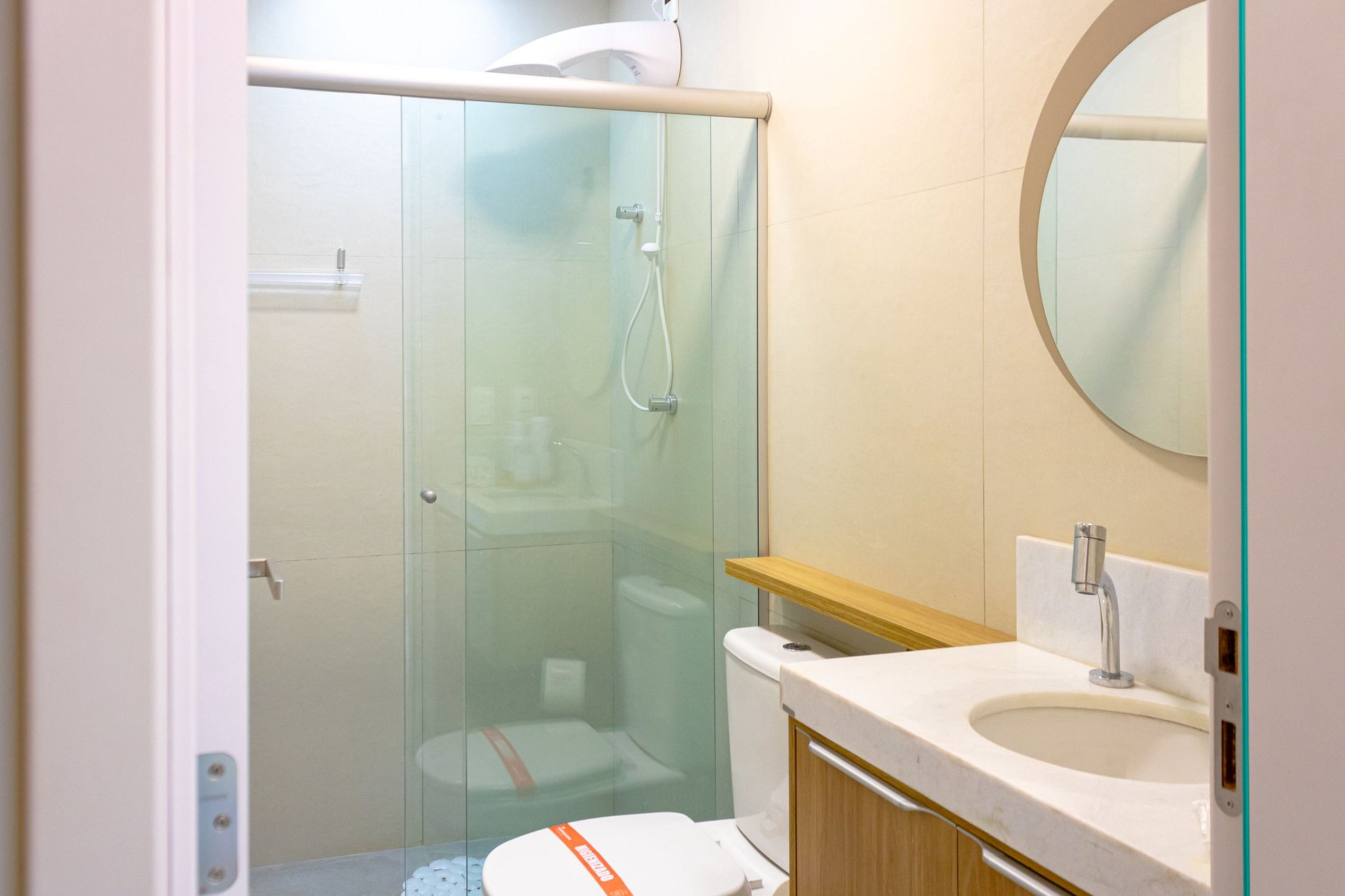 A unidade está equipada com ar-condicionado e um sistema de iluminação planejada que destaca as áreas principais e cria uma atmosfera aconchegante.