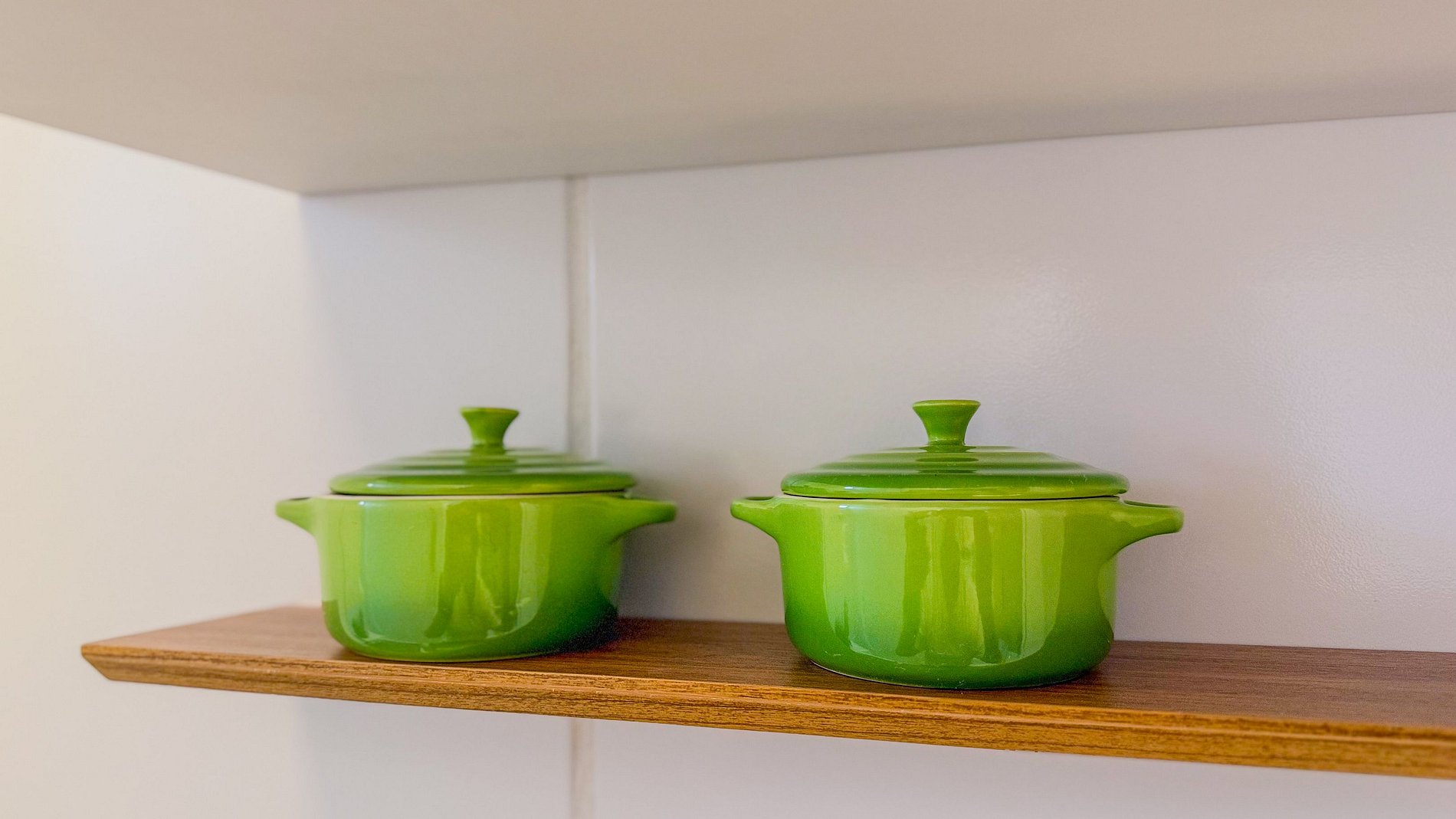 Nichos e prateleiras na cozinha e banheiro aproveitam o espaço vertical de forma eficiente.
