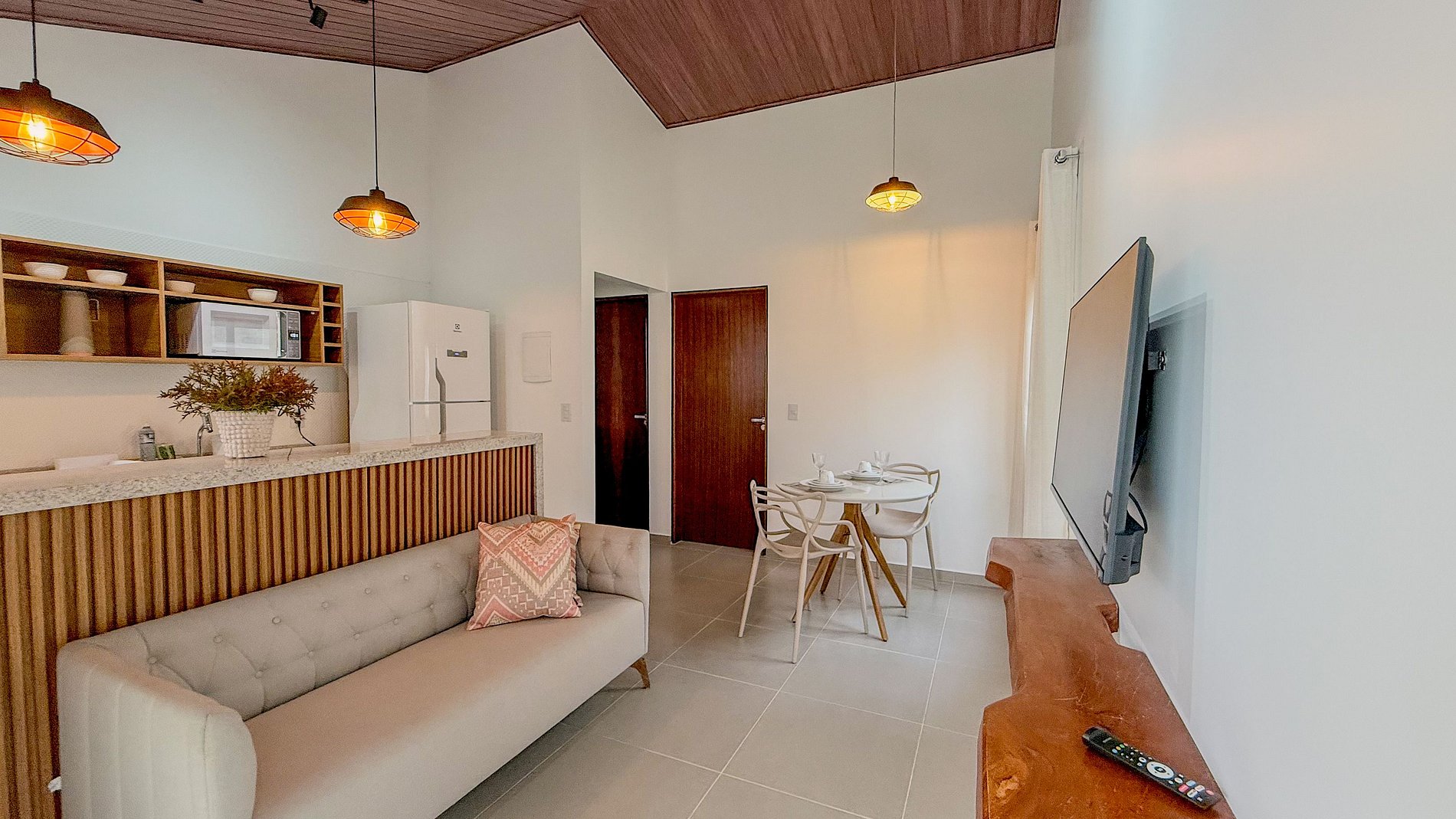 A área de estar com o sofá e a mesa de jantar, mesmo que dimensionadas para o espaço, são funcionais e convidativas, ideais para socialização, refeições ou simplesmente para relaxar após um dia explorando a região.