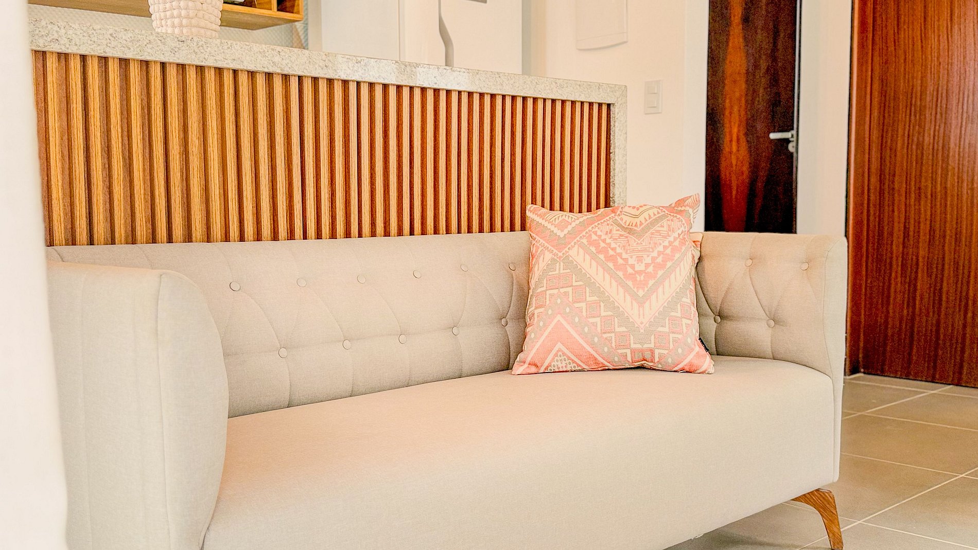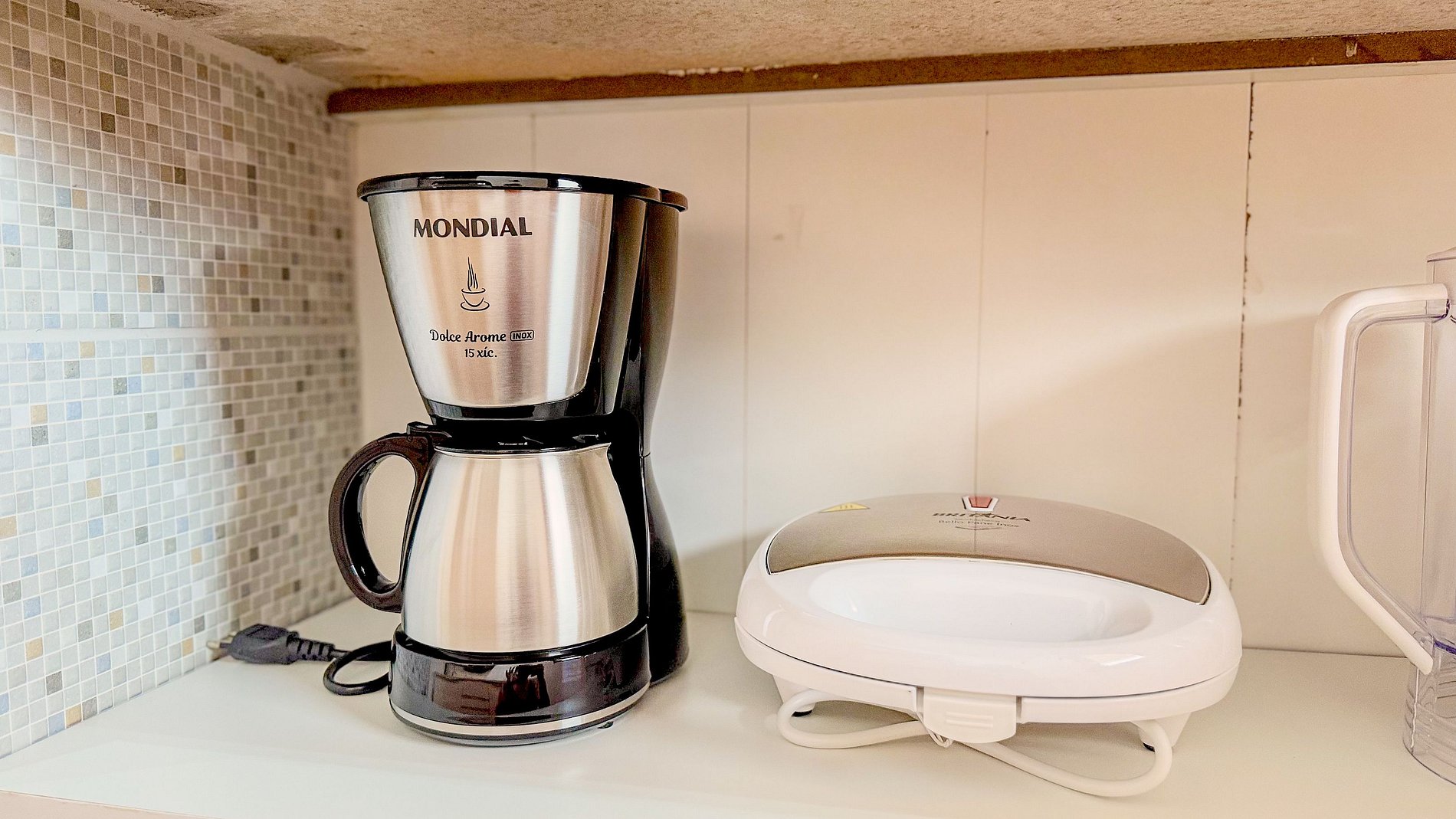Cada metro quadrado foi inteligentemente otimizado. A cozinha, embora compacta, é exemplar em sua funcionalidade, com eletrodomésticos essenciais discretamente integrados. A marcenaria sob medida, como o armário no quarto, demonstra um planejamento cuidadoso para o conforto e organização do hóspede.