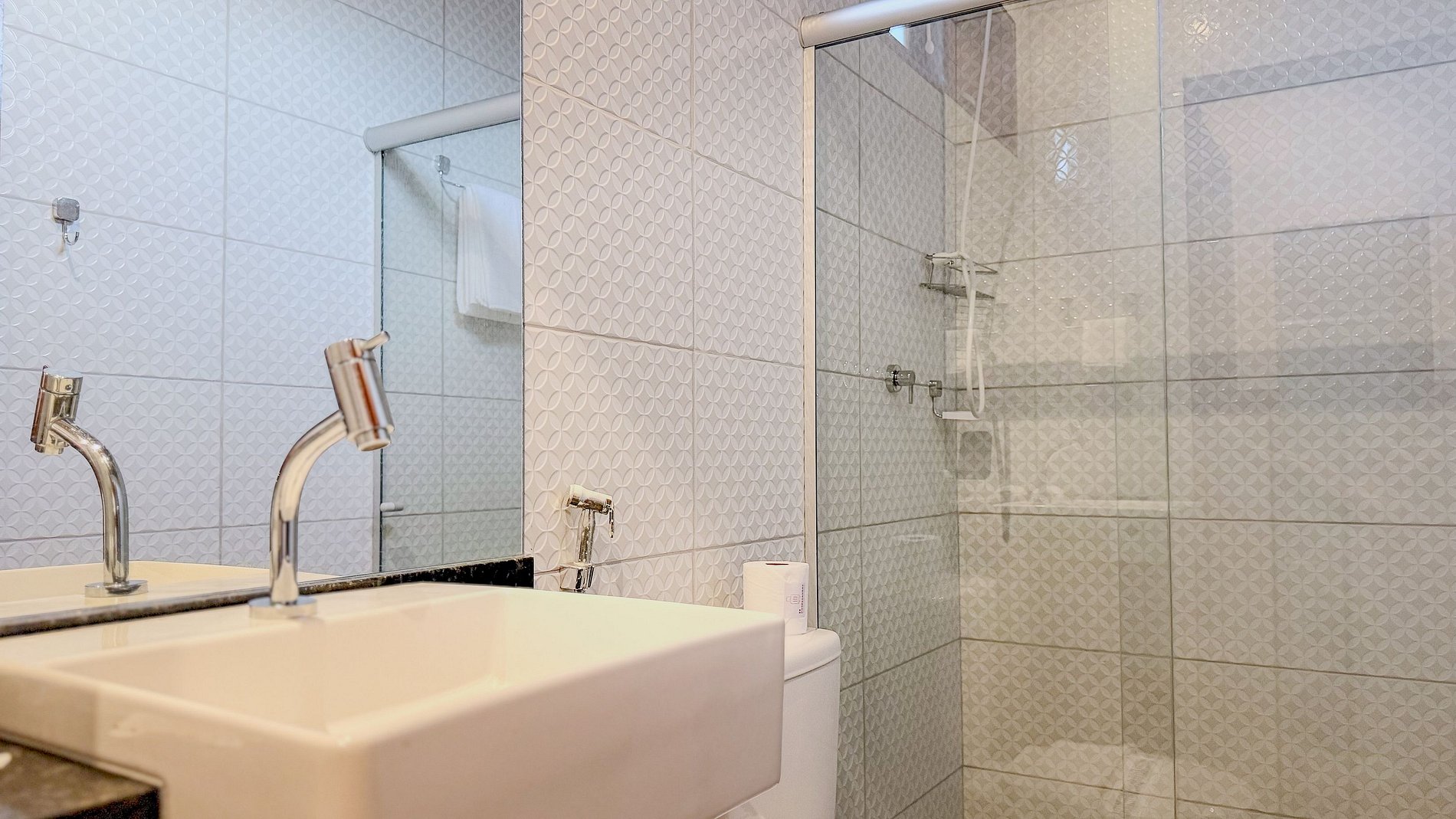 O banheiro, com seu design clean, acabamentos modernos e box de vidro, transmite uma sensação impecável de higiene e bem-estar, essencial para a experiência do hóspede.