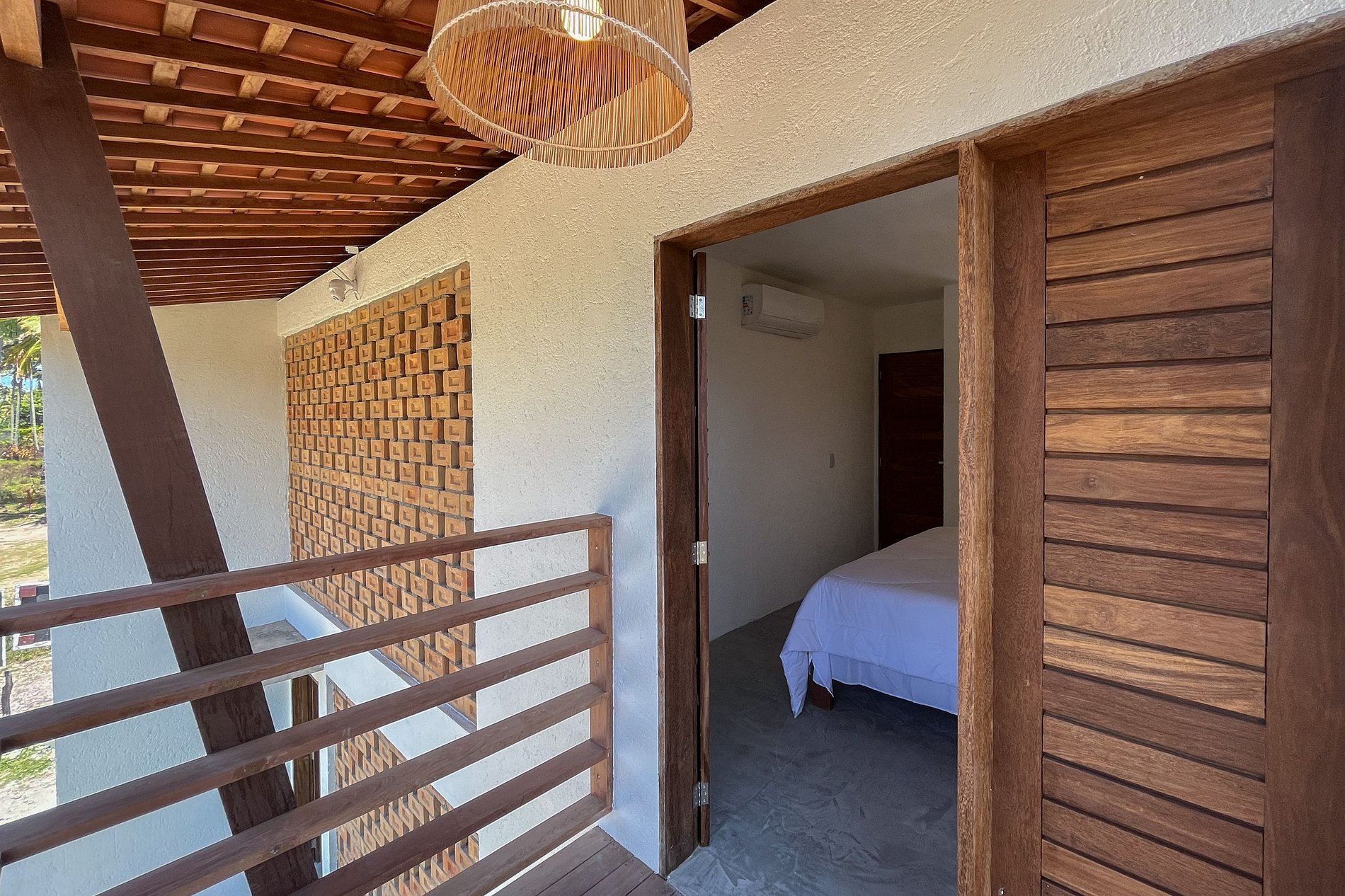 Arquitetura moderna com paredes vazadas para ventilação e luz natural.