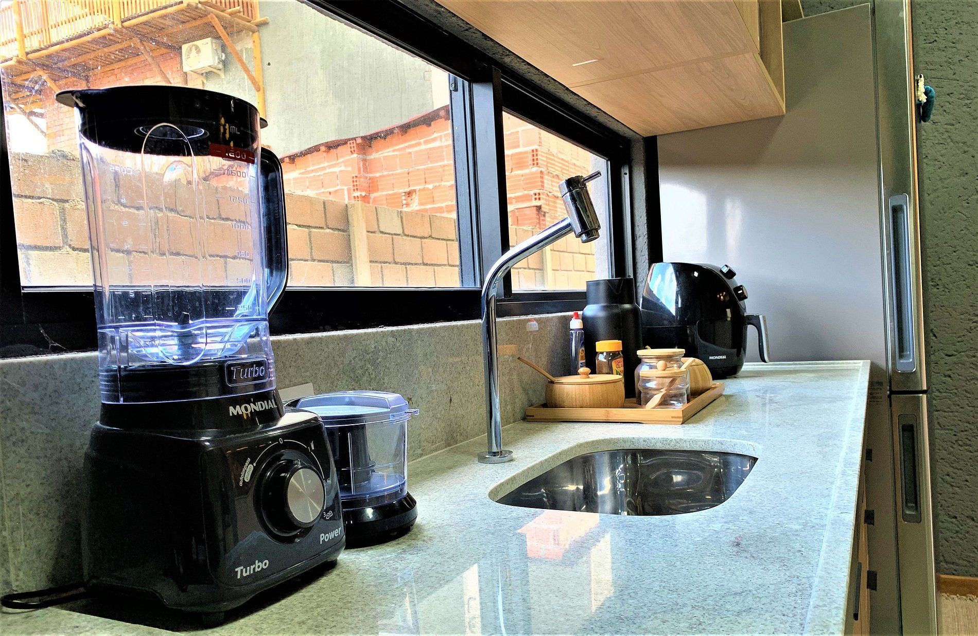 Possui 63m2, sendo 1 suíte e 1 quarto duplo solteiro, 1 banheiro, sala de estar com varanda gourmet e churrasqueira, cozinha, área de serviço e 01 vaga privativa