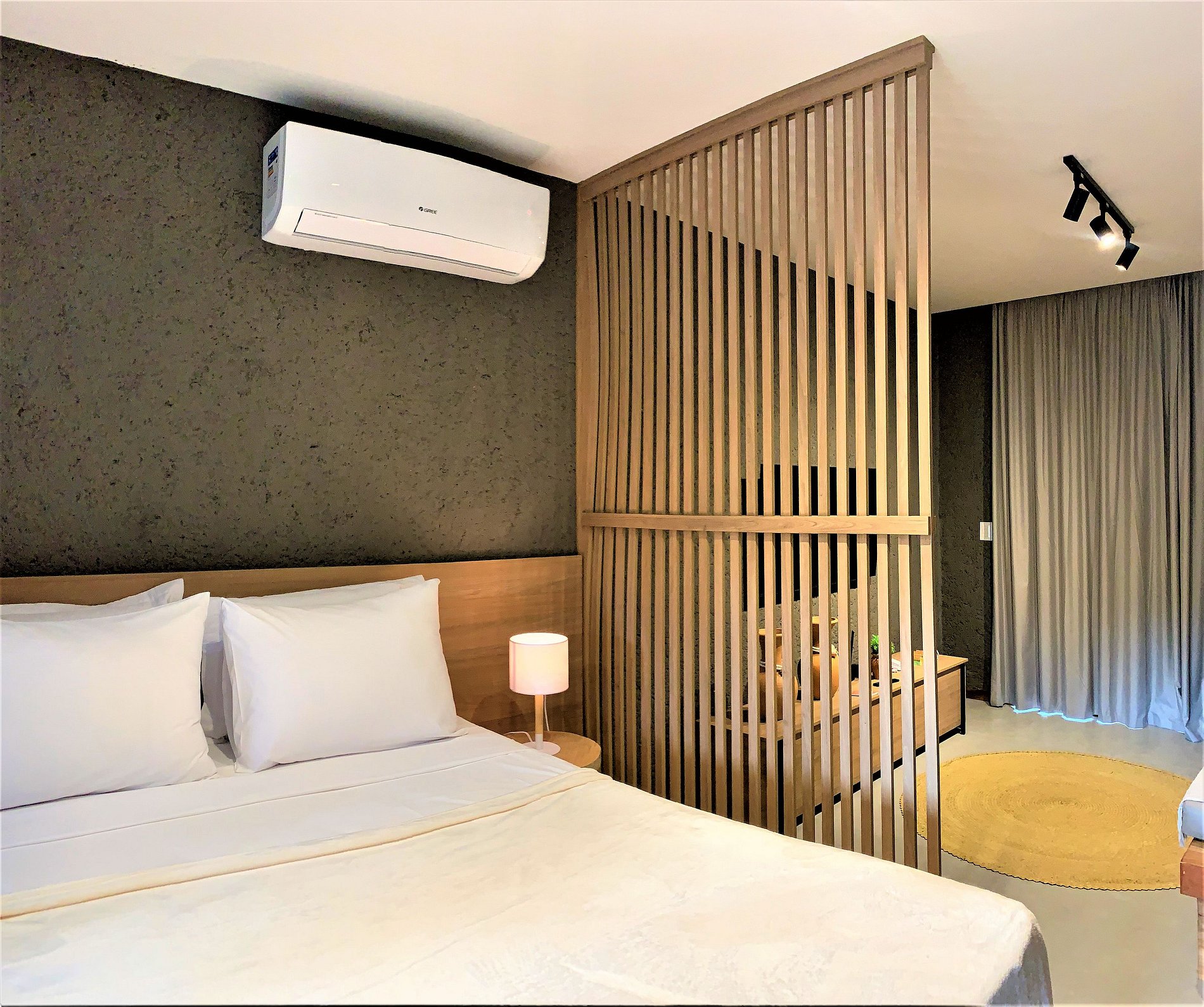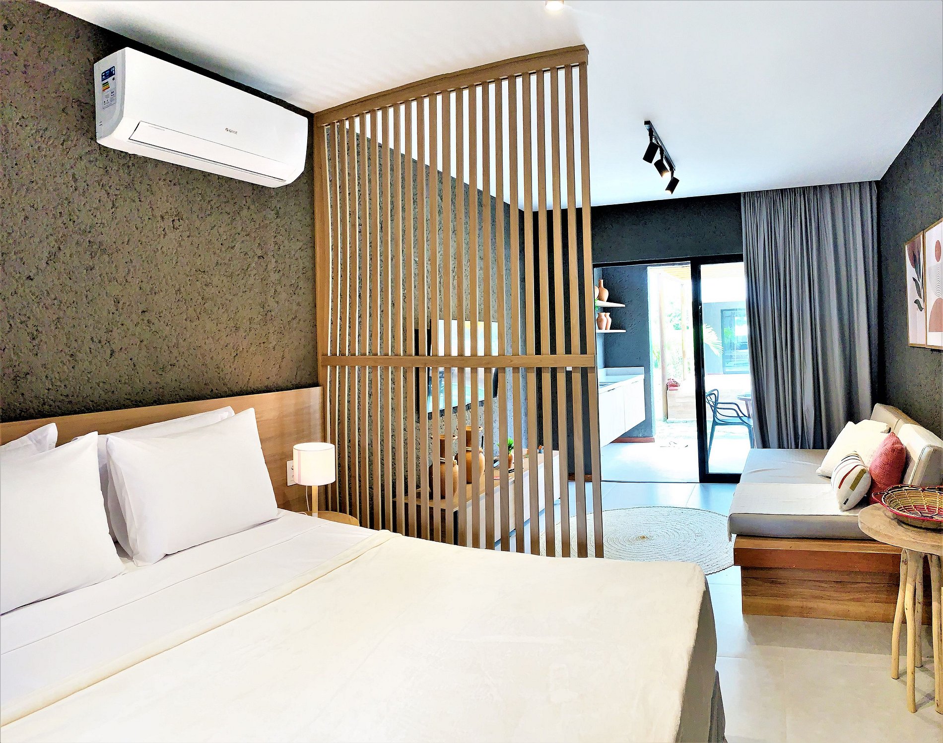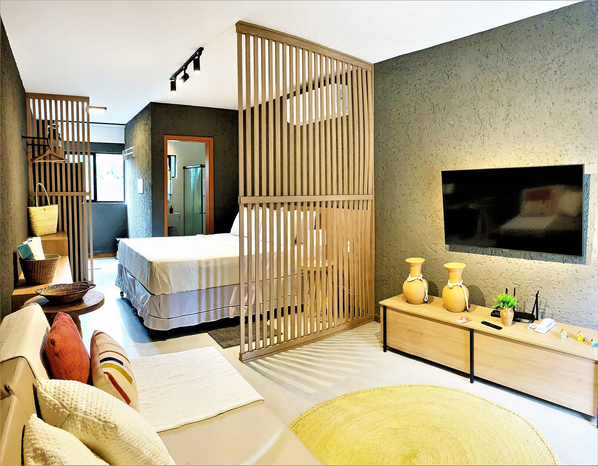 O Studio possui 37,15m2, com sala de estar com varanda gourmet, cozinha e 01 vaga de estacionamento.