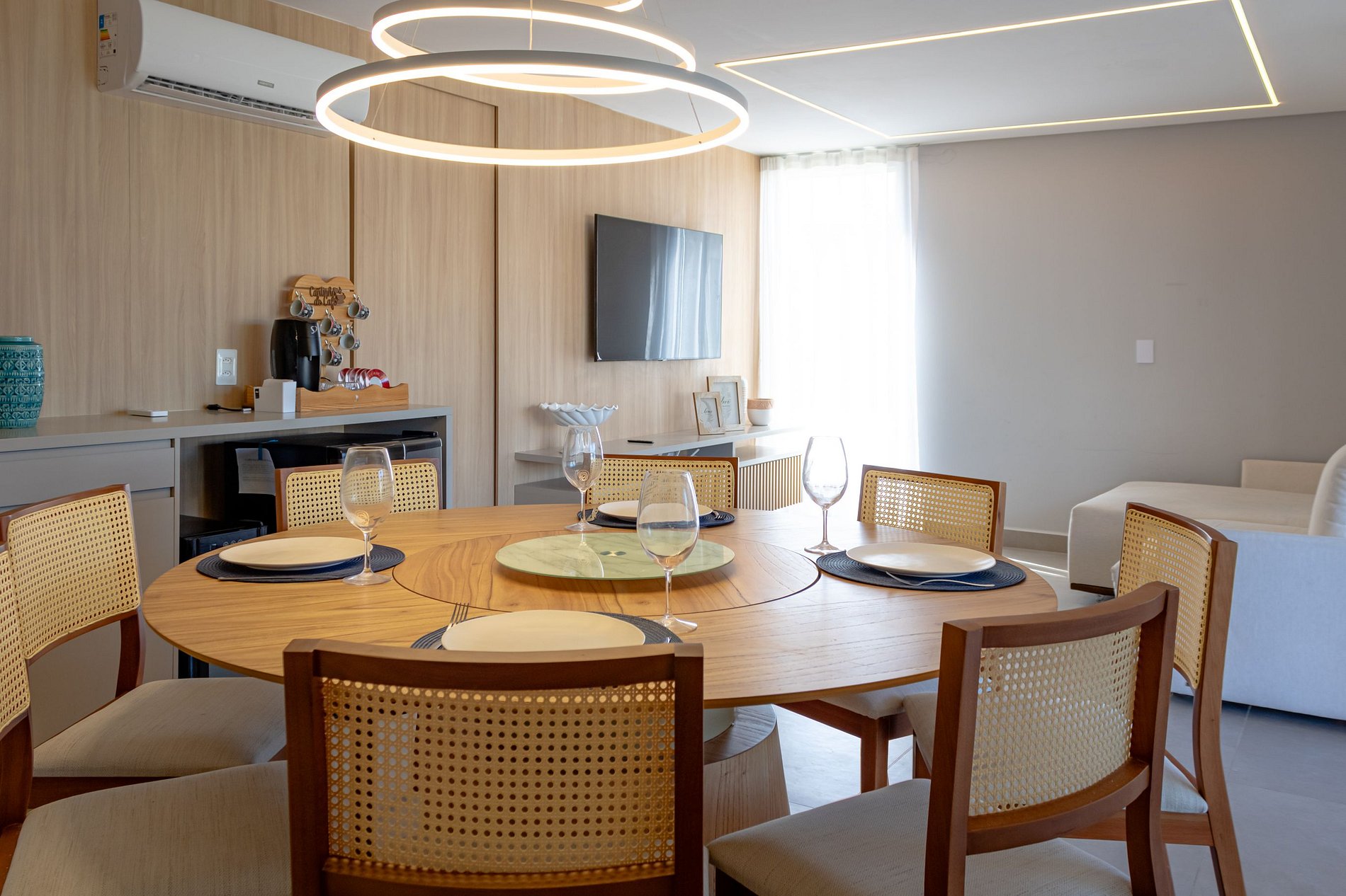 A unidade está equipada com ar-condicionado e um sistema de iluminação planejada que destaca as áreas principais e cria uma atmosfera aconchegante.