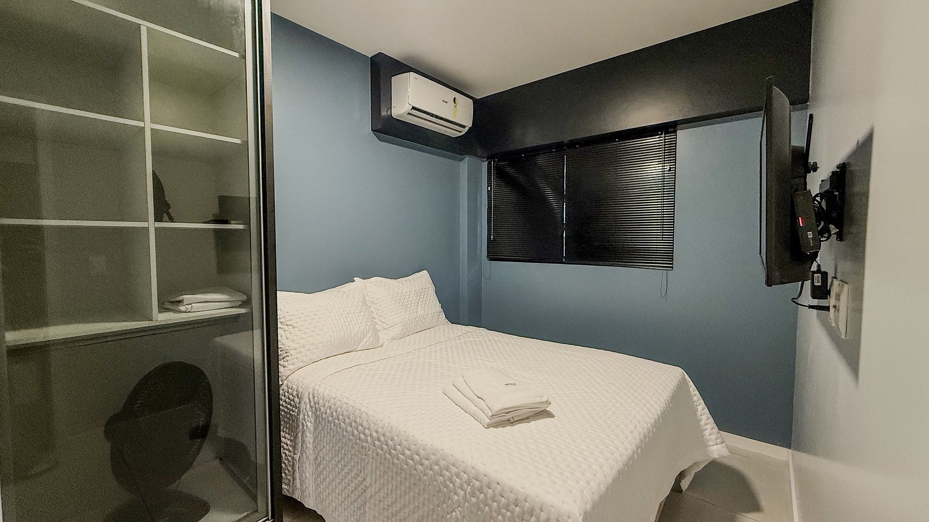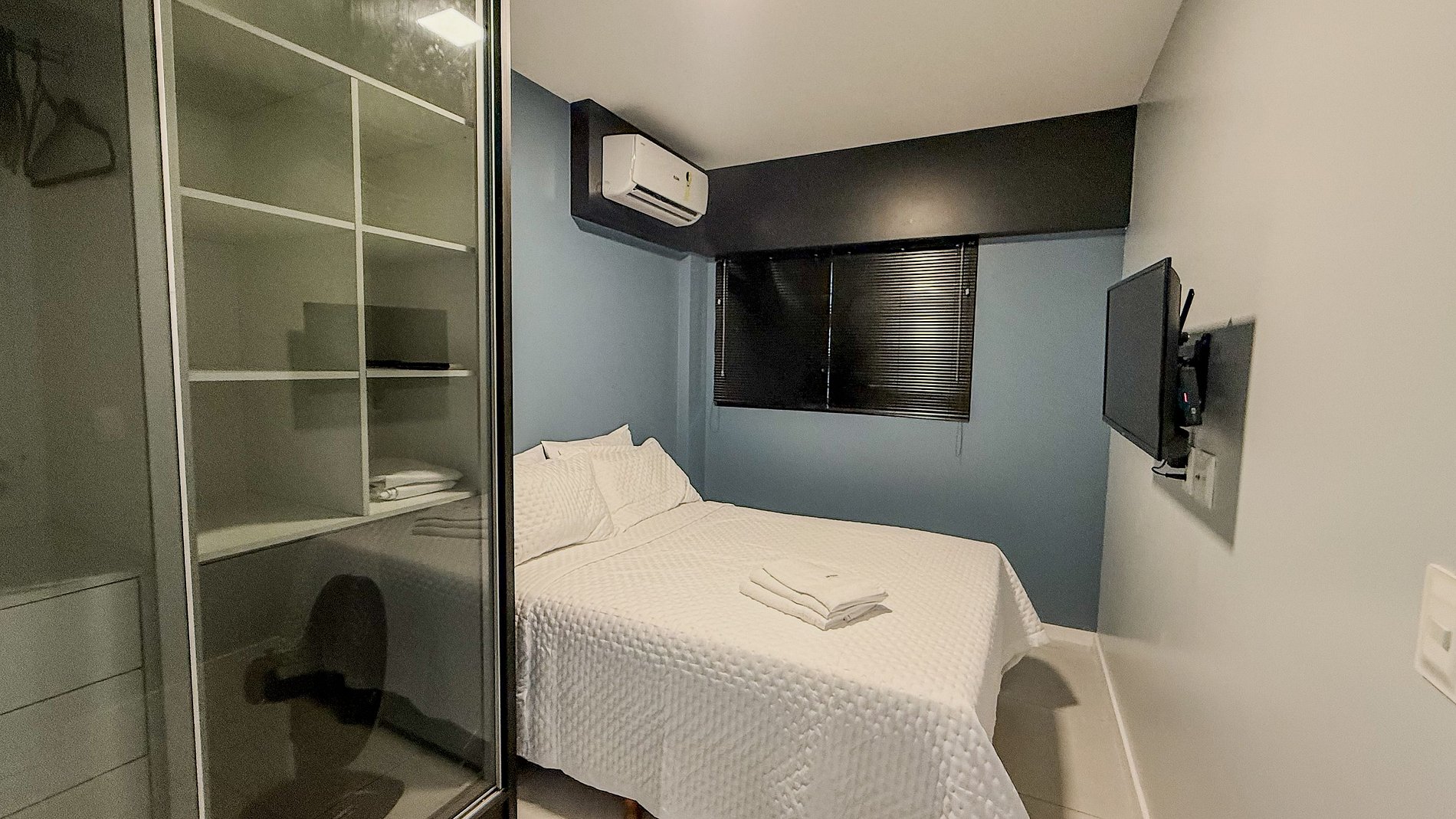 O quarto é concebido como um refúgio, com uma cama confortável, enxoval impecável e um guarda-roupa espaçoso e funcional. A parede em tom de azul adiciona uma profundidade e um toque de sofisticação, enquanto a persiana na janela permite o controle da luminosidade para um sono verdadeiramente reparador.