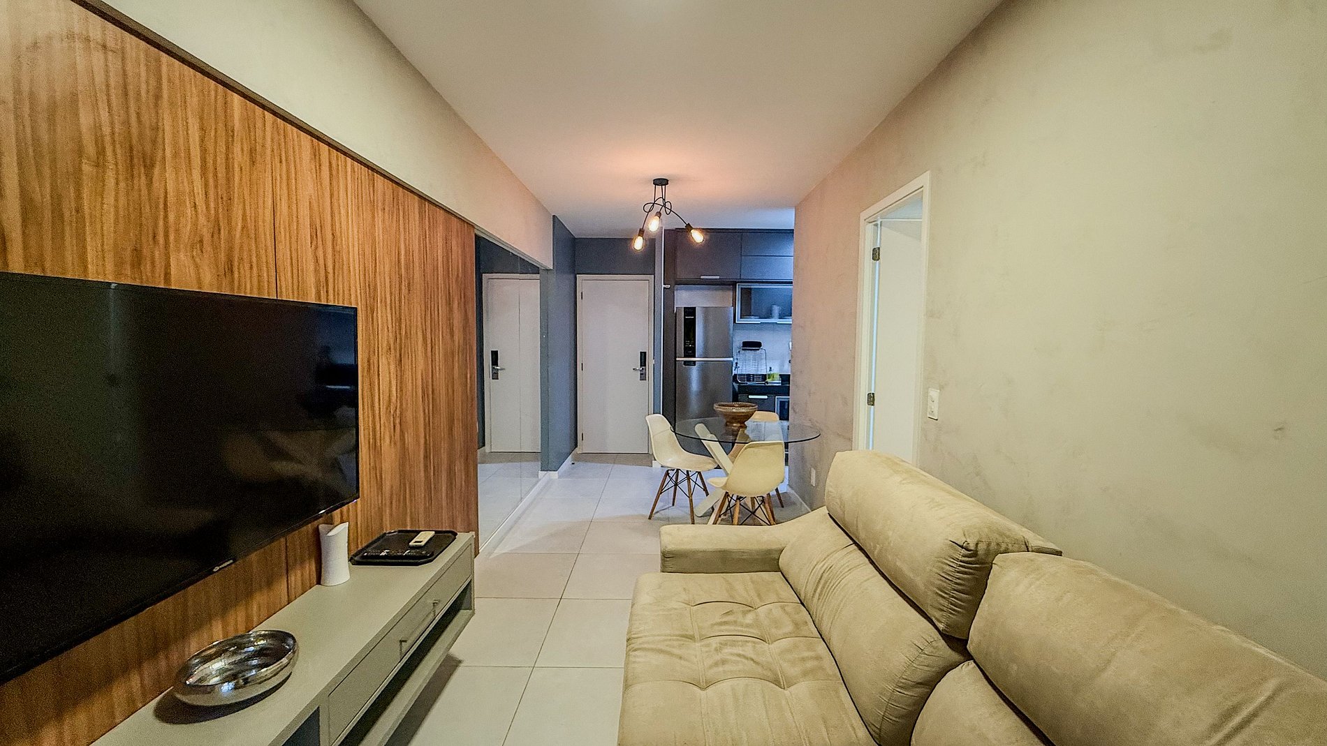 As TVs estrategicamente posicionadas na sala e no quarto oferecem opções de entretenimento, permitindo que os hóspedes relaxem e desfrutem de seus conteúdos favoritos.