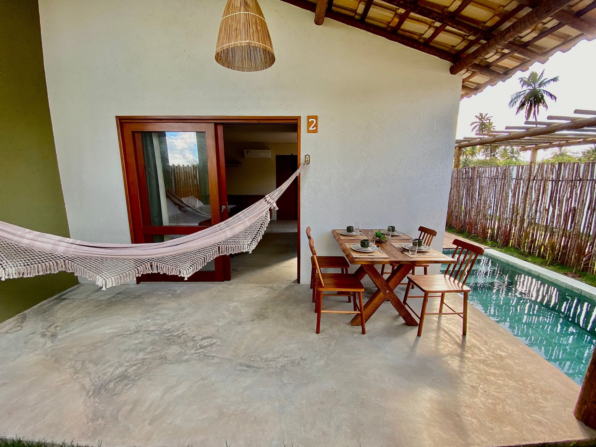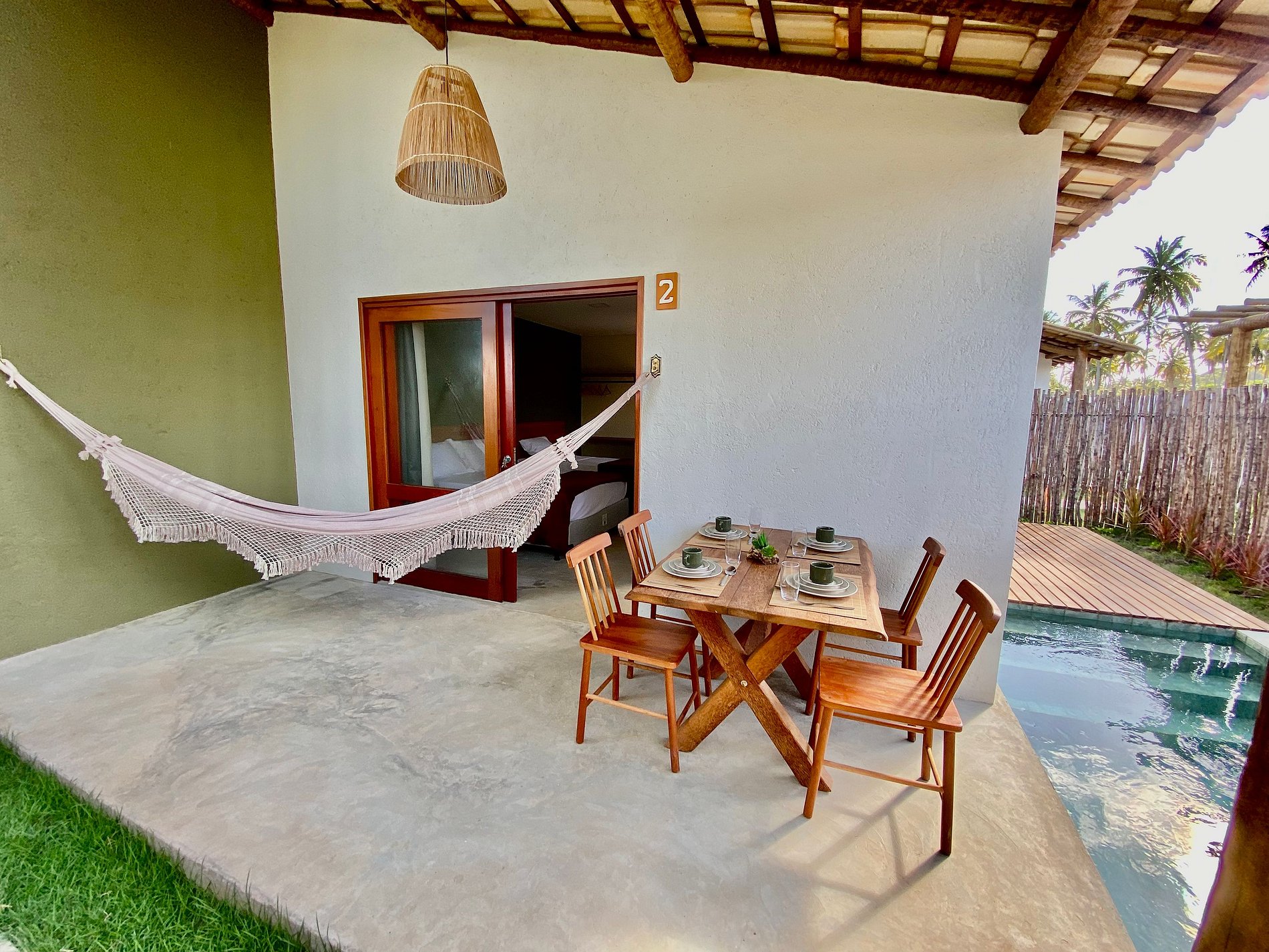 Todas as acomodações possuem piscina privativa ao ar livre, jardim, ar-condicionado, varanda térrea e Wi-Fi gratuito.
