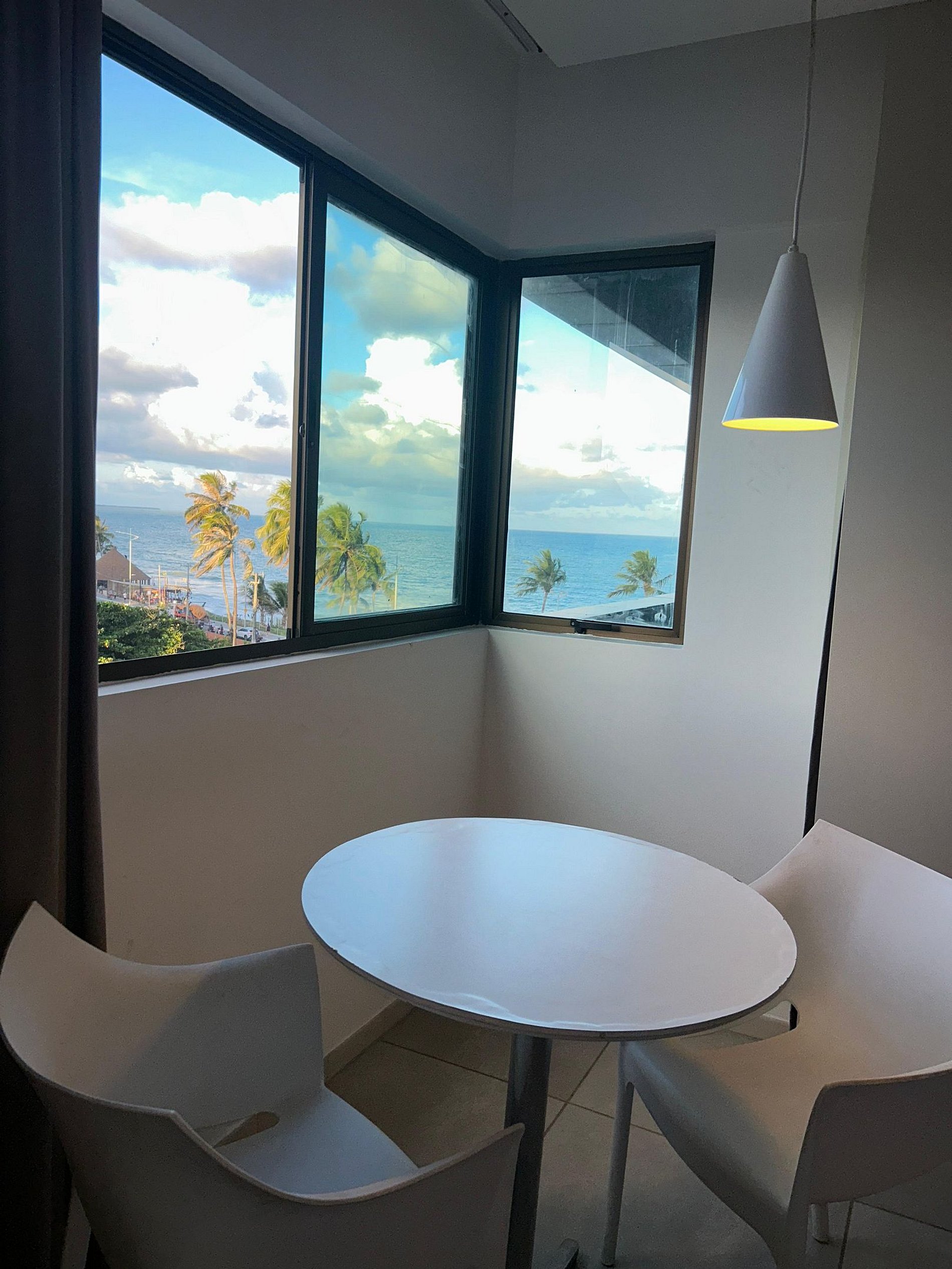 Quarto perfeito pra quem busca se hospedar a beira-mar em Maceió, a unidade possui 2 camas confortáveis de casal e acomoda até 04 pessoas com um banheiro completo e um frigobar, com uma linda vista da praia que pode apreciada da sua janela. O quarto fica na posição nascente que permite ver o nascer do Sol.